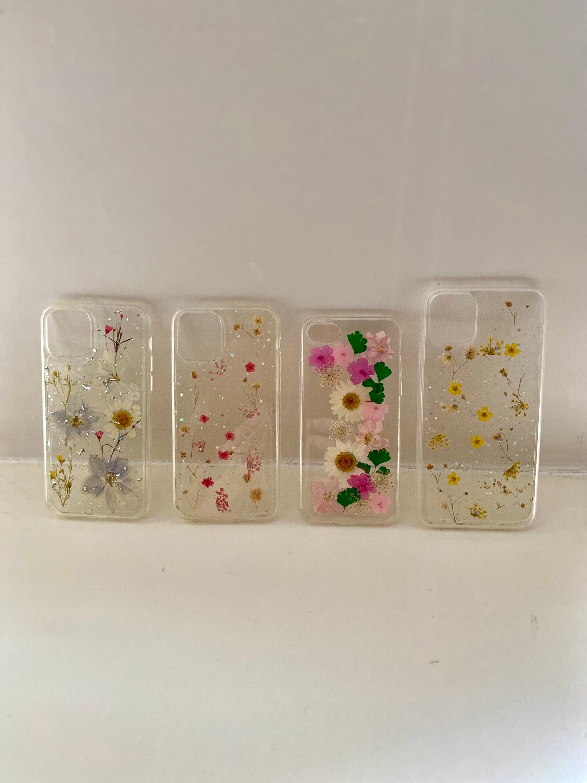 Iphone telefoon hoesjes met bloemetjes in verschillende kleuren en bloemetjes.