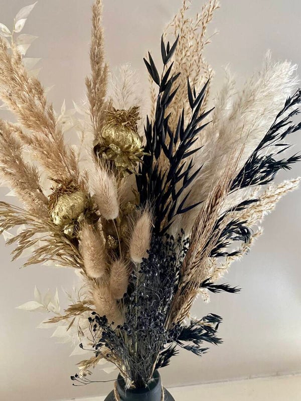 gevuld met zwart/naturel/goudkleurige droogbloemen met een totale hoogte van ongeveer 45cm