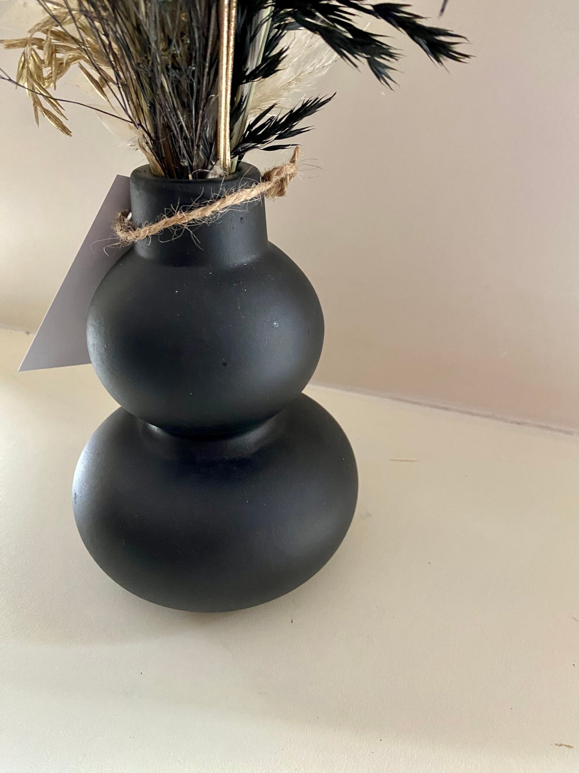 “Vaas mat zwart 15cm met zwart/naturel/goudkleurige droogbloemen”
