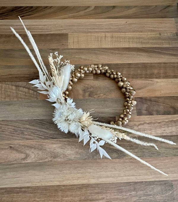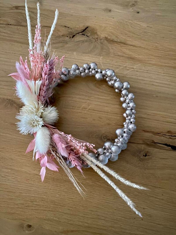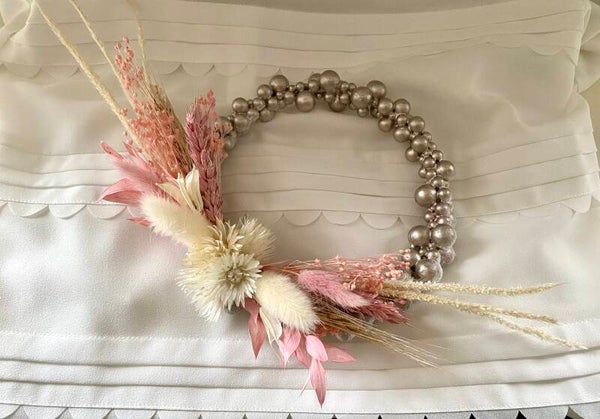 Super mooie taart decoratie in de vorm van een ring met balletjes en droogbloemen.