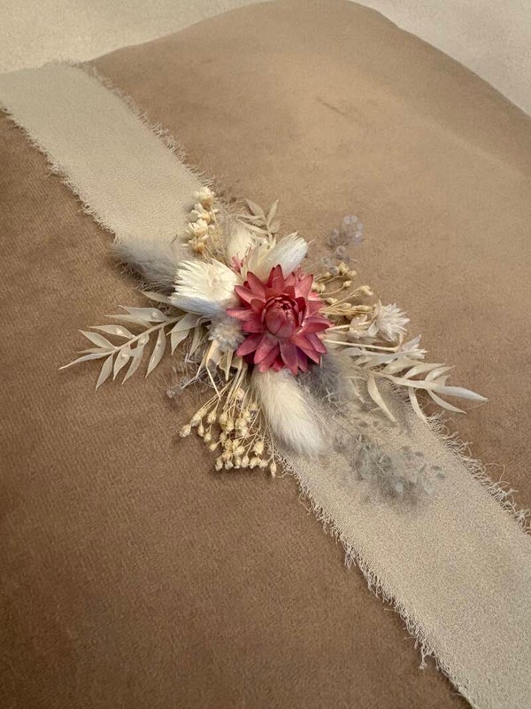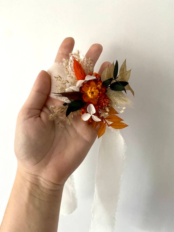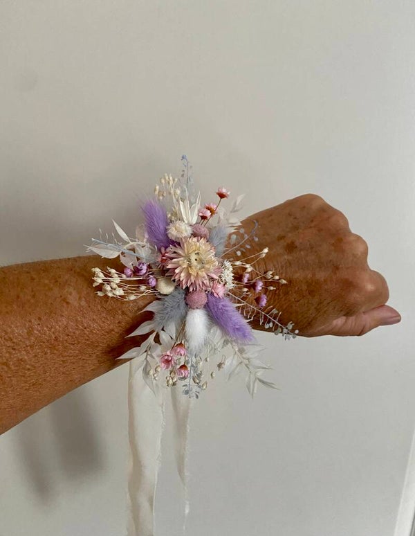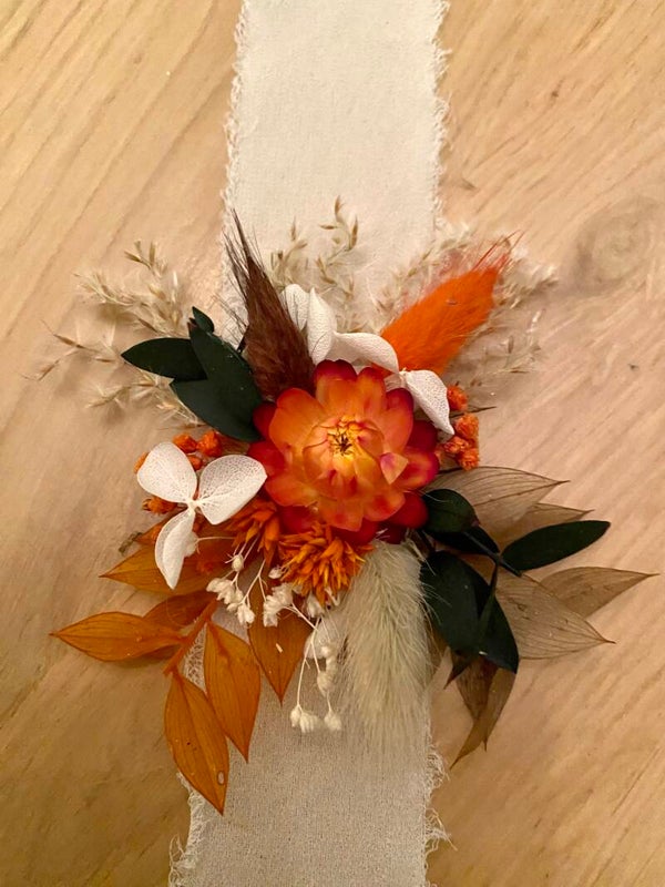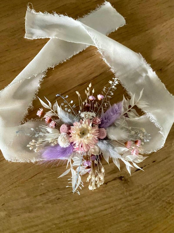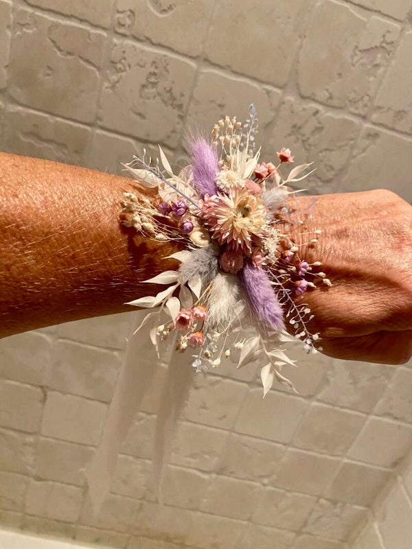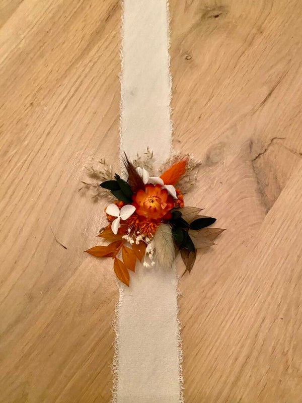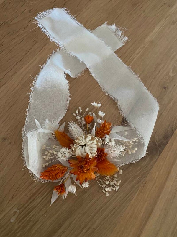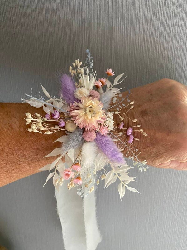 Zo ga ik te werk. Kleur van de droogbloemen heb je doorgeven, ik leg deze bij elkaar en stuur je een foto via whatsappe. Als de kleur en droogbloemen goedgekeurd zijn door jou ga ik de polscorsage of hoedcorsage maken en naar je verzenden. Dit is op maat gemaakt en kan niet retour verzonden worden als het goedgekeurd is.