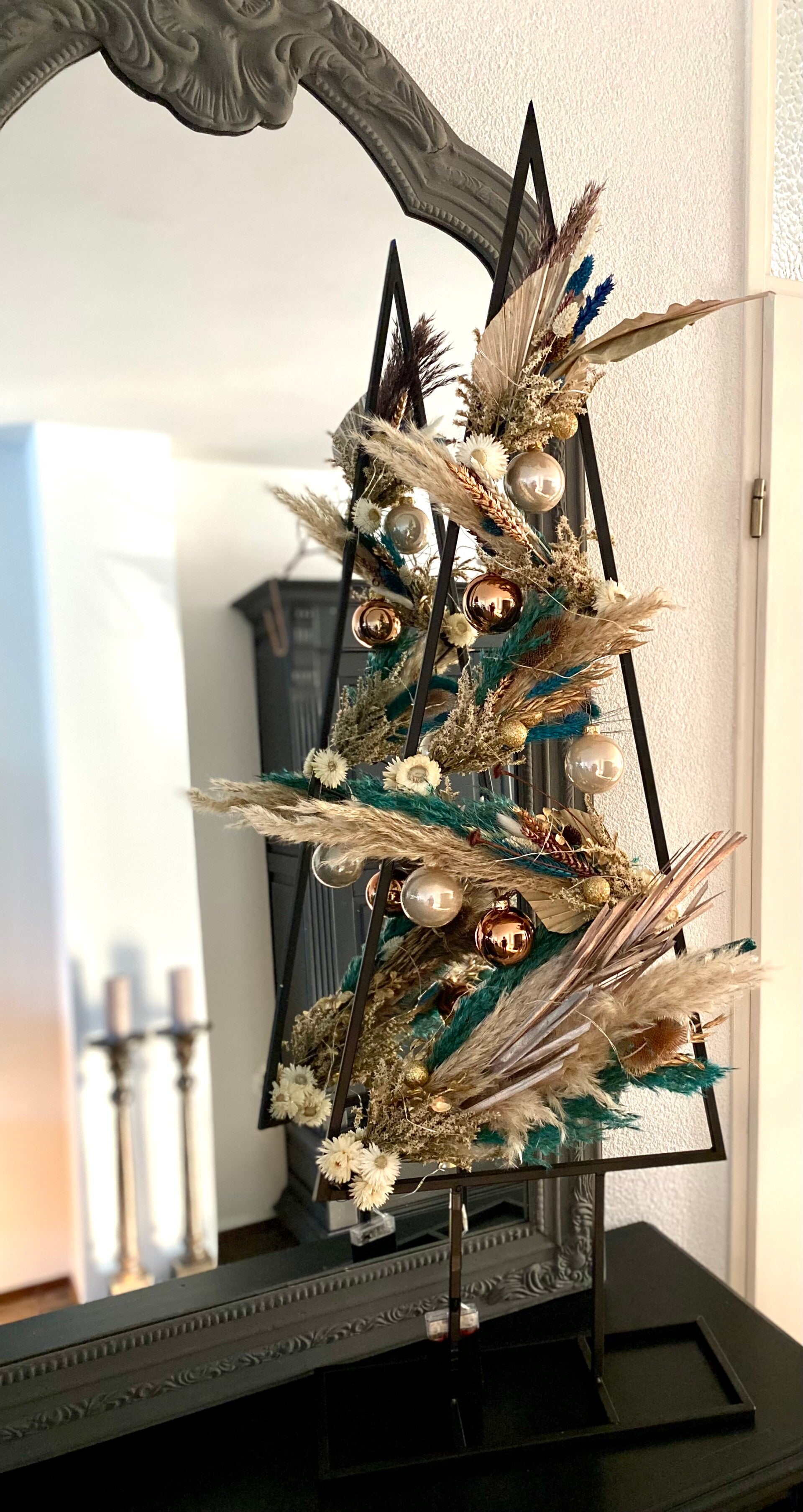 “Zwart metalen kerstboom 120cm hoog met droogbloemen, kerstballen en verlichting”