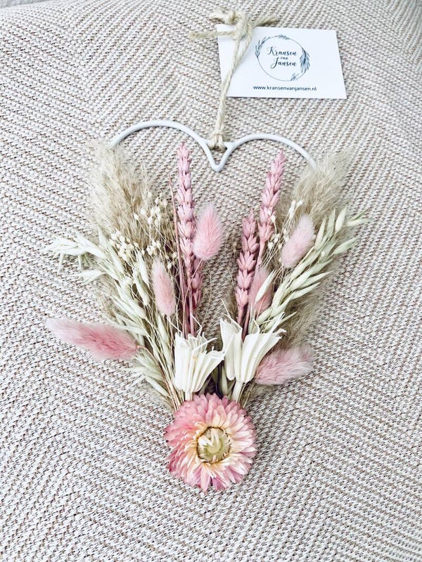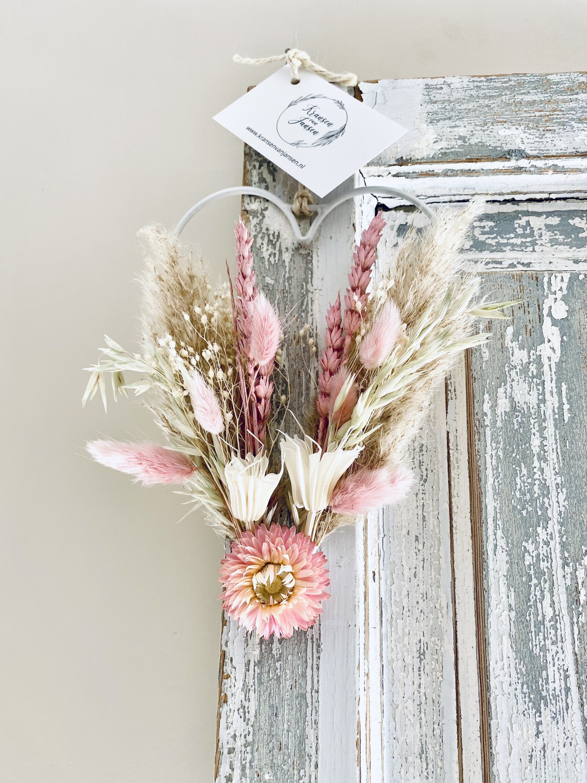 “Mini hartje met droogbloemen 14x20cm goudkleurig, zwart of wit inclusief droogbloemen”