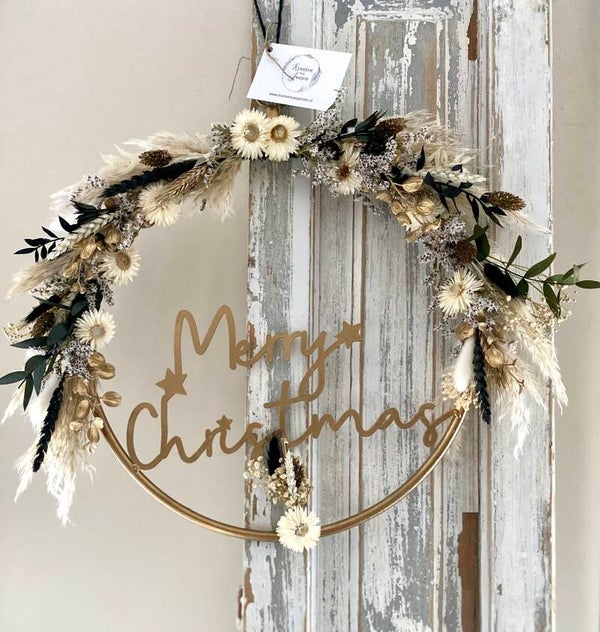 voorzien van naturel/goud/groen en zwarte droogbloemen
