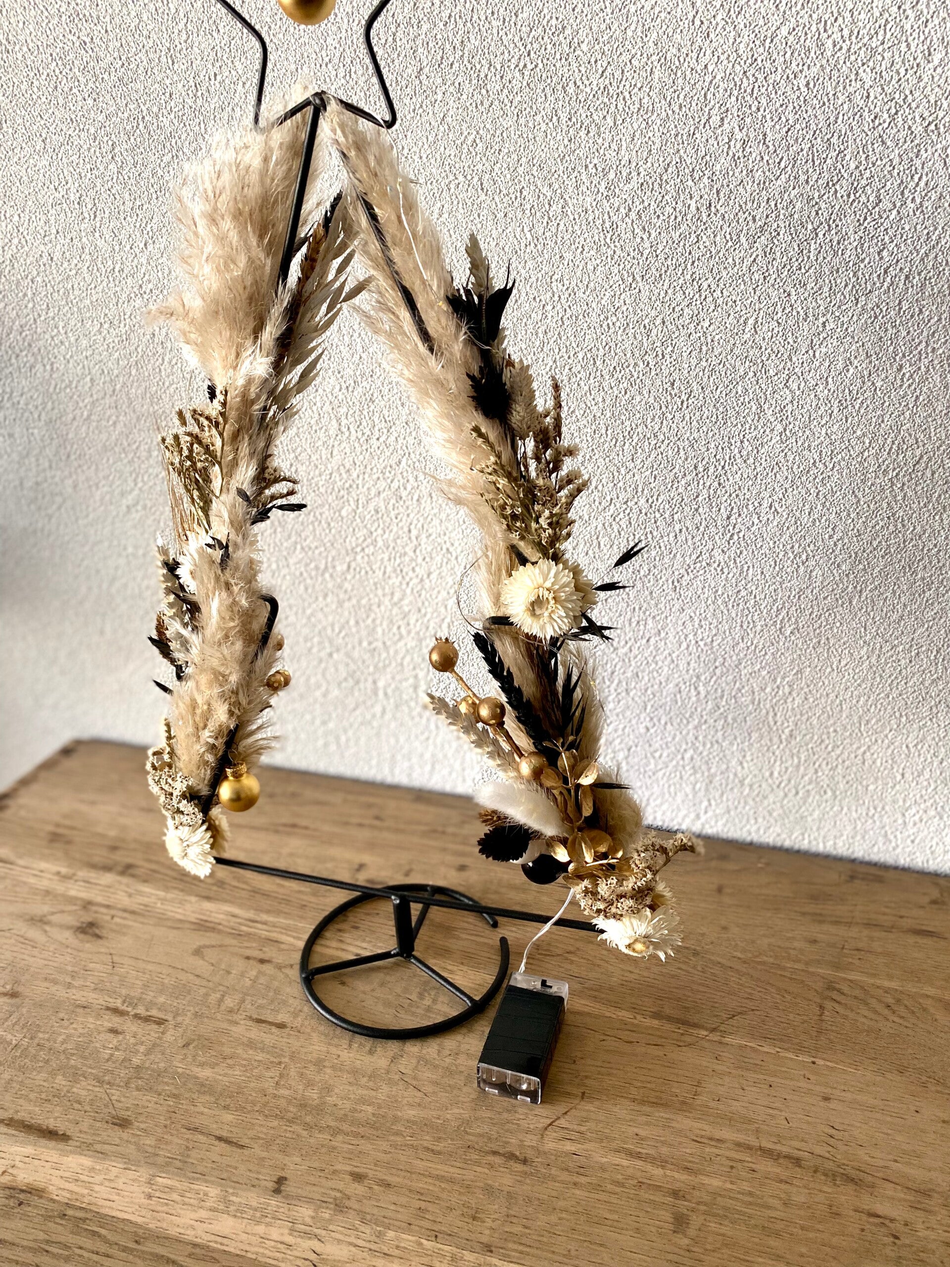 Inclusief zwart/wit/goudkleurige droogbloemen en mini kerstballetjes + verlichting in de kleur warm wit. Wordt geleverd zoals op de foto.